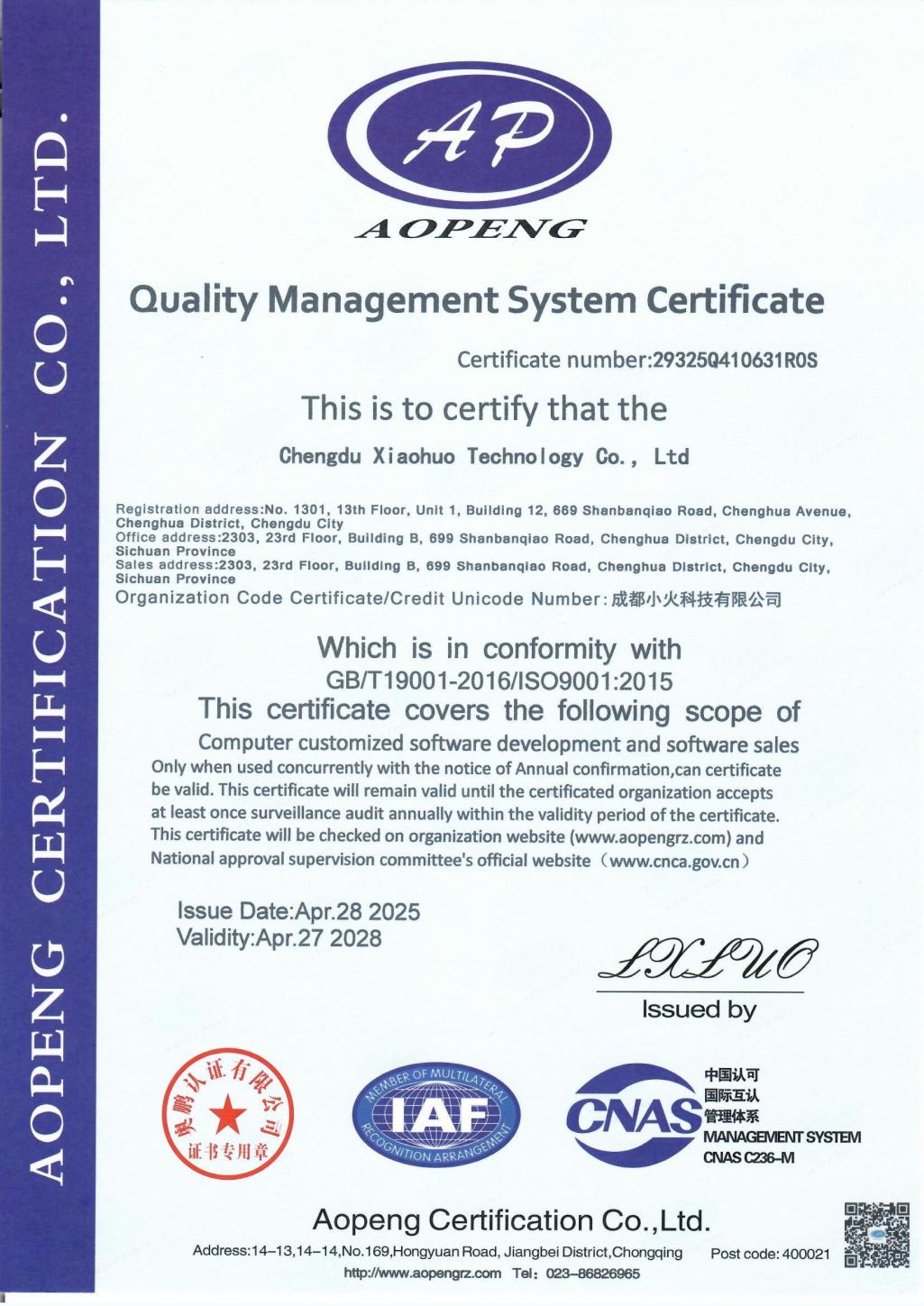 [24]成都小火科技有限公司拥有ISO9001质量管理体系认证(证书编号:29325Q410631R0S),信息来源:奥鹏认证有限公司http://www.aopengrz.com/query/zscx/