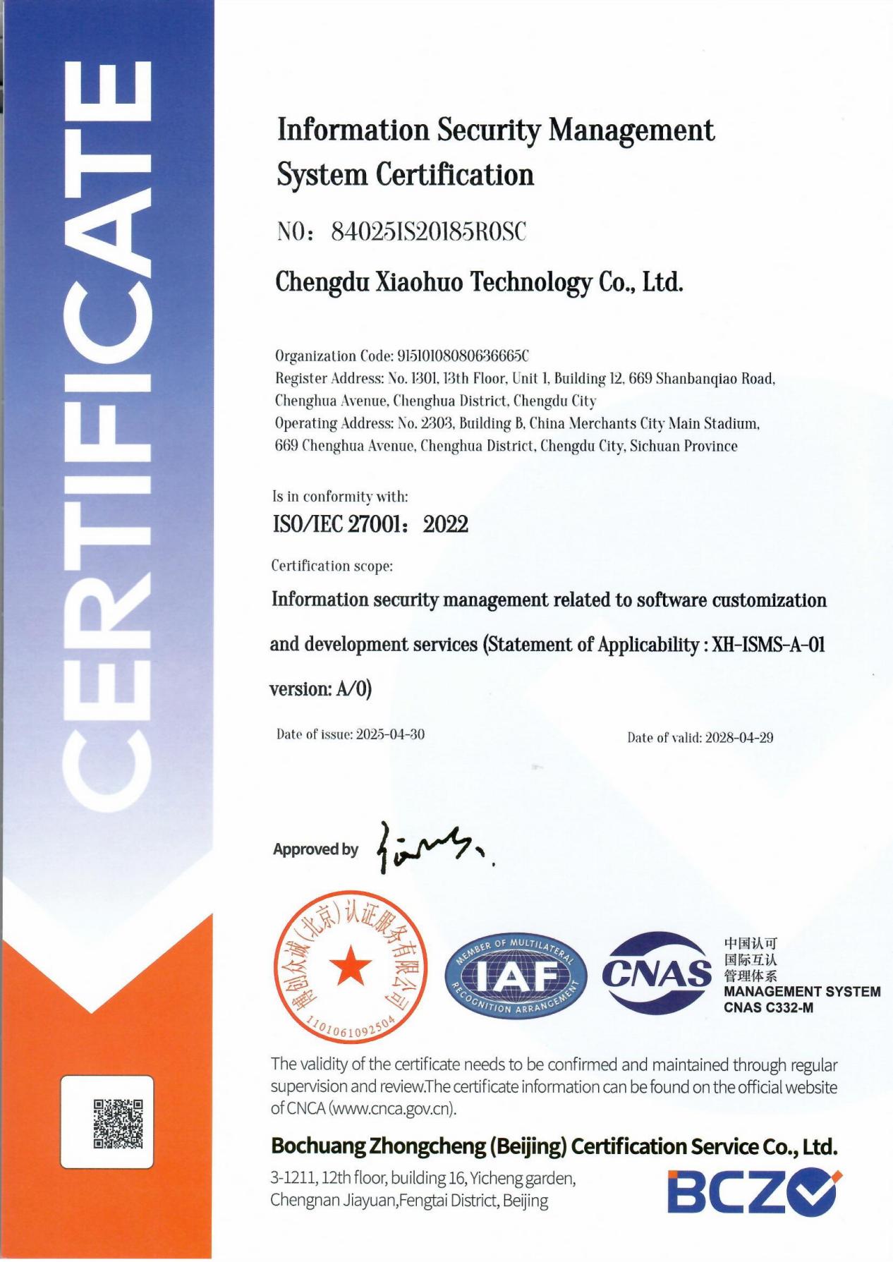 [25]成都小火科技有限公司拥有ISO27001信息安全管理体系认证(证书编号:840251S20185R0SC),信息来源:国家认证认可监督管理委员会https://www.cnca.gov.cn/