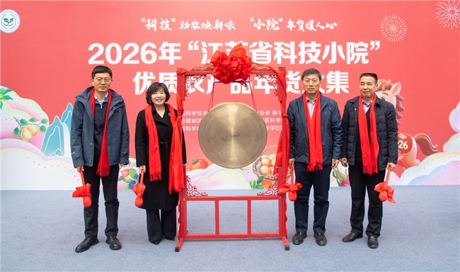省科协党组成员、副主席夏军、新华日报社副总编辑,交汇点大平台执行负责人杭春燕、南京市科协一级调研员许光明和建邺区委常委、副区长卫明月共同为2026年“江苏省科技小院”优质农产品年货大集开街。