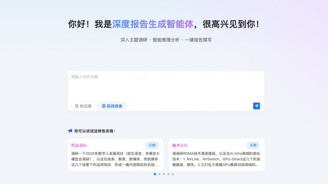 深度报告生成功能支持用户输入一个研究主题,并选择“仅用知识库”、“仅联网搜索”或“混合模式”。系统将自动进行深度研究,生成结构完整、引用清晰的调研报告,并支持自定义风格与修改大纲。